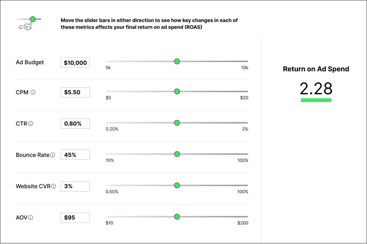 If you want to see how much your return on ad spend changes with fluctuations in various key metrics in paid advertising then look no further than our ROAS calculator.