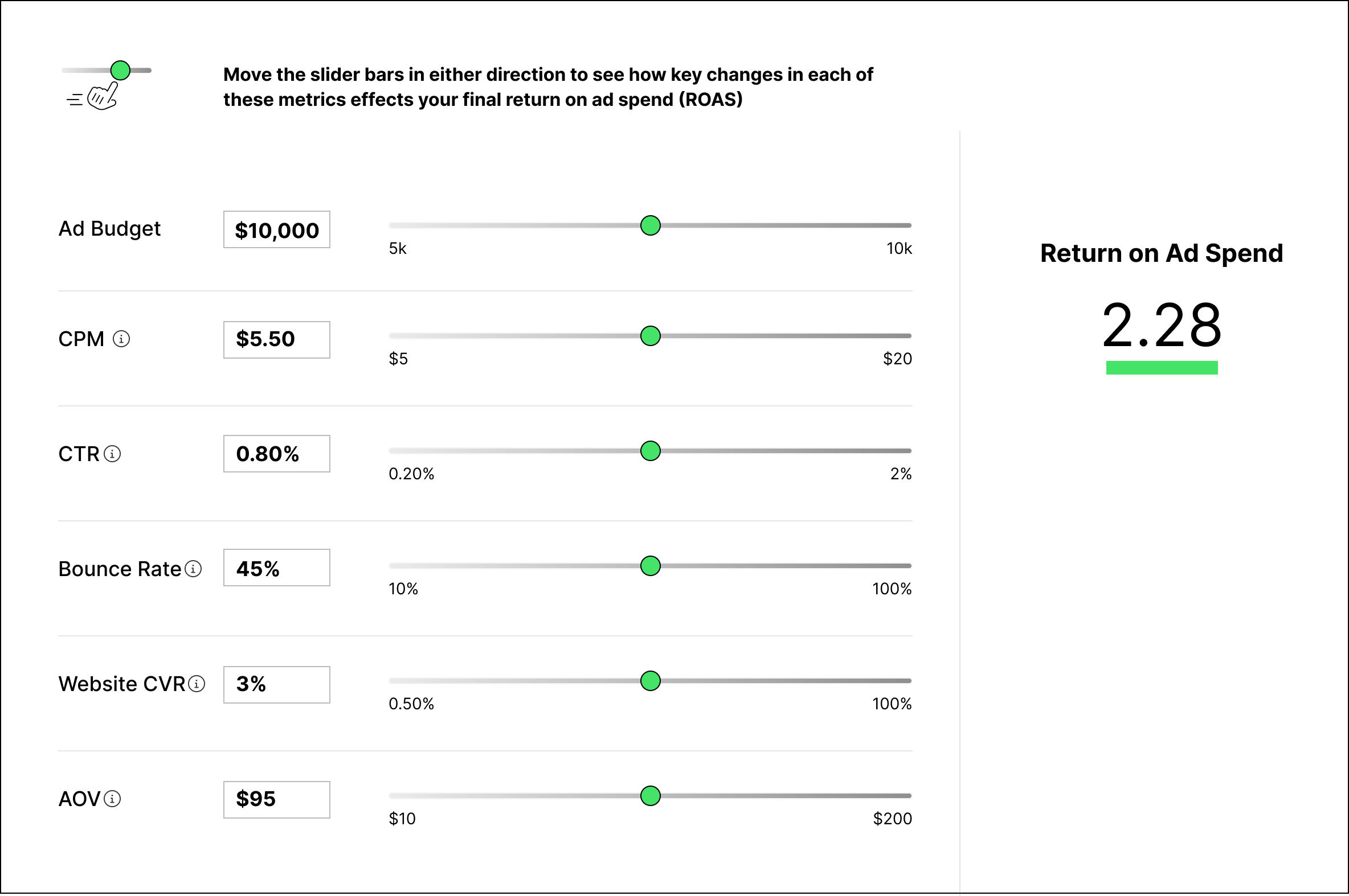 If you want to see how much your return on ad spend changes with fluctuations in various key metrics in paid advertising then look no further than our ROAS calculator.
